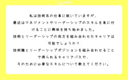 私は技術系の仕事に就いていますが、最近はマネジメントやリーダーシップのスキルを身に付けることに興味を持ち始めました。技術とリーダーシップの両方を組み合わせたキャリアは可能でしょうか?技術職とリーダーシップポジションを組み合わせることで得られるキャリアパスや、そのために必要なスキルについて教えてください。