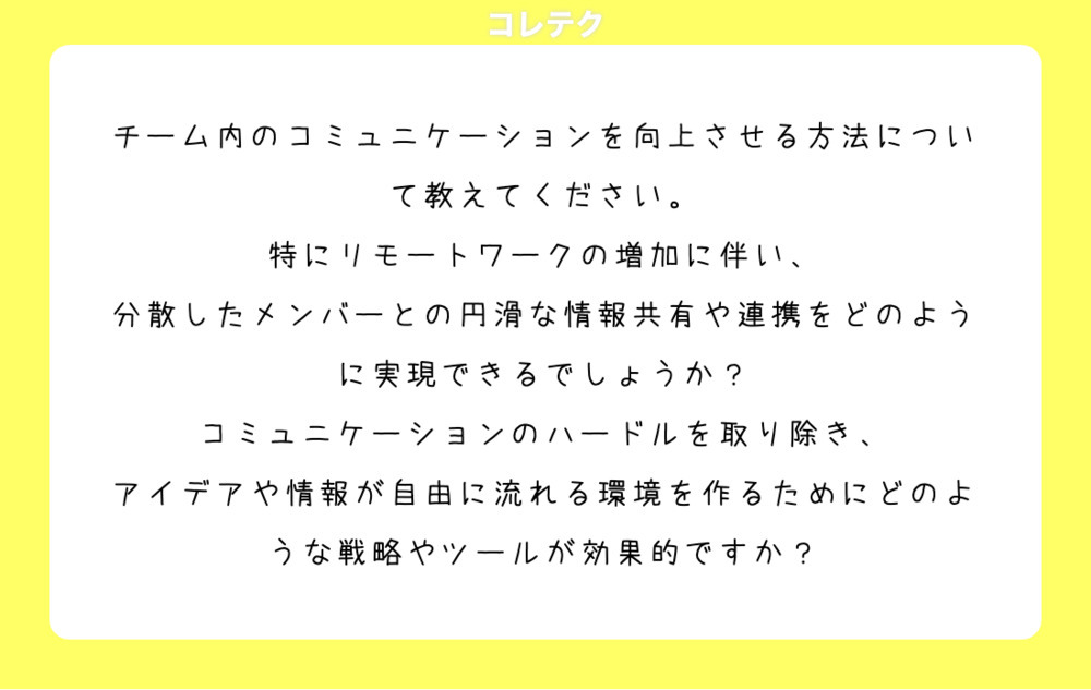 チーム内のコミュニケーションを向上させる方法について特にリモートワークの増加に伴い、分散したメンバーとの円滑な情報共有や連携をどのように実現できるでしょうか?コミュニケーションのハードルを取り除き、アイデアや情報が自由に流れる環境を作るためにどのような戦略やツールが効果的ですか?