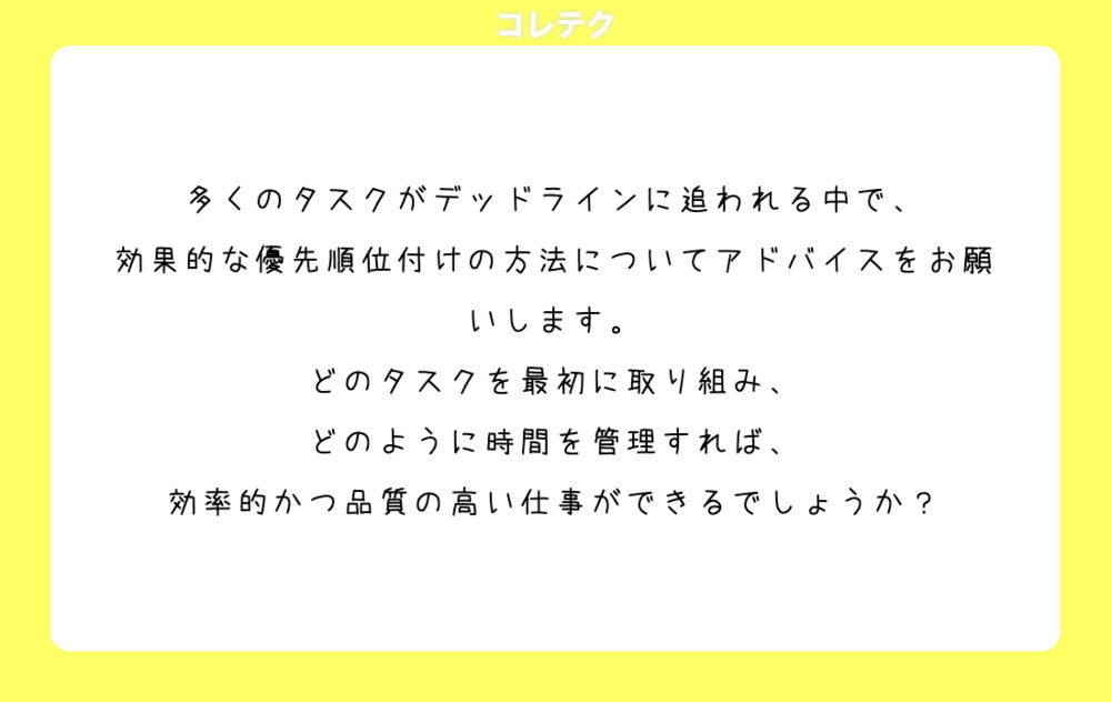 多くのタスクがデッドラインに追われる中で、効果的な優先順位付けの方法についてアドバイスをお願いします。どのタスクを最初に取り組み、どのように時間を管理すれば、効率的かつ品質の高い仕事ができるでしょうか?