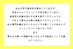 私は大学で経済学を専攻していますが、将来のキャリアについて不安を感じています。経済学の知識を活かす仕事を探すべきでしょうか、それとも異なる分野に挑戦すべきでしょうか?私の専門知識を生かしたキャリアを築くことの利点とデメリットについて知りたいです。また、異なる分野への挑戦が私にもたらす可能性についても教えてください。