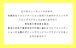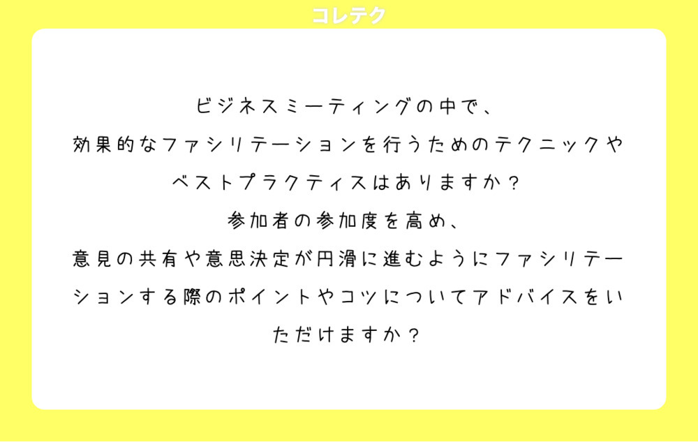 ビジネスミーティングの中で、効果的なファシリテーションを行うためのテクニックやベストプラクティスはありますか?参加者の参加度を高め、意見の共有や意思決定が円滑に進むようにファシリテーションする際のポイントやコツについてアドバイスをいただけますか?
